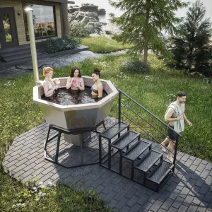 Прочная и удобная лестница из кедра позволит комфортно подниматься и погружаться в воду.