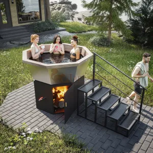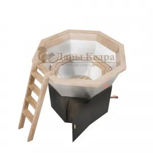 Банный чан с ветрозащитой изготовлен из пищевой стали. Представляет собой большую ёмкость в виде чаши, при нагревании которой можно париться на свежем воздухе. Банный чан установлен на металлическую закрытую подставку, которая служит защитой от ветра и печью одновременно. В комплект такой модели входит дымоход 2 метра. Чан оборудован кедровым бортом, скамейками, подспинниками, трапом для ног и приставной лестницей.
