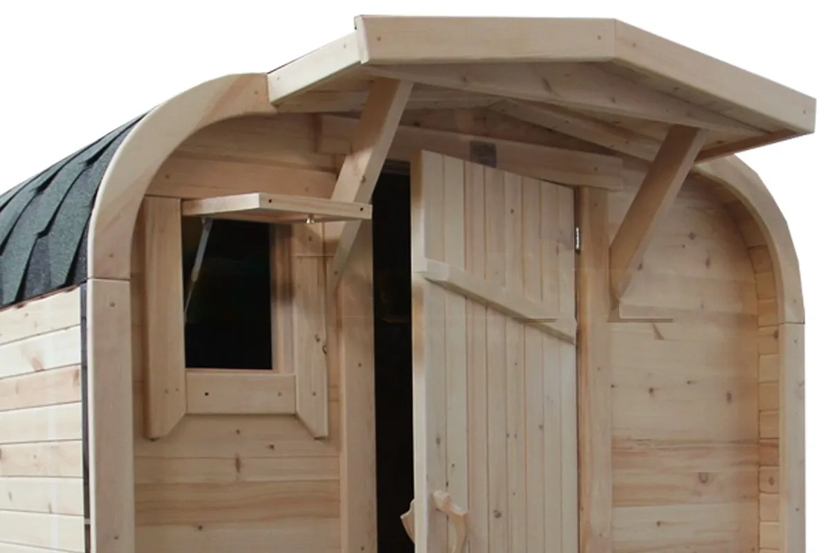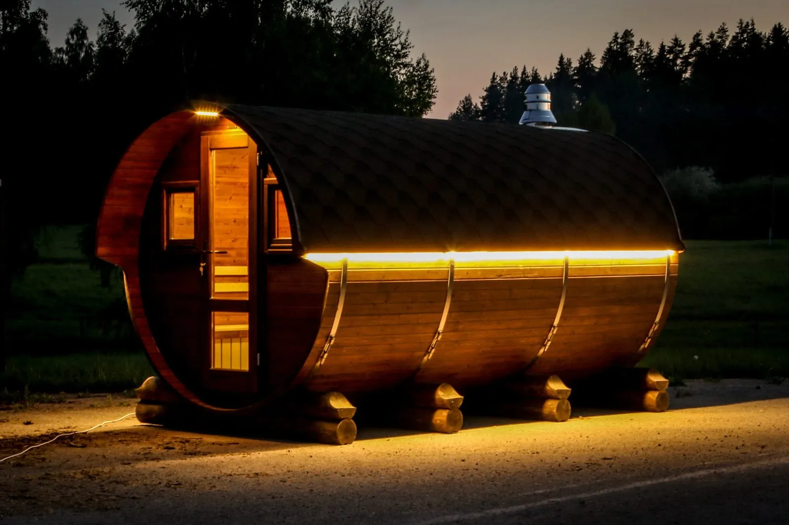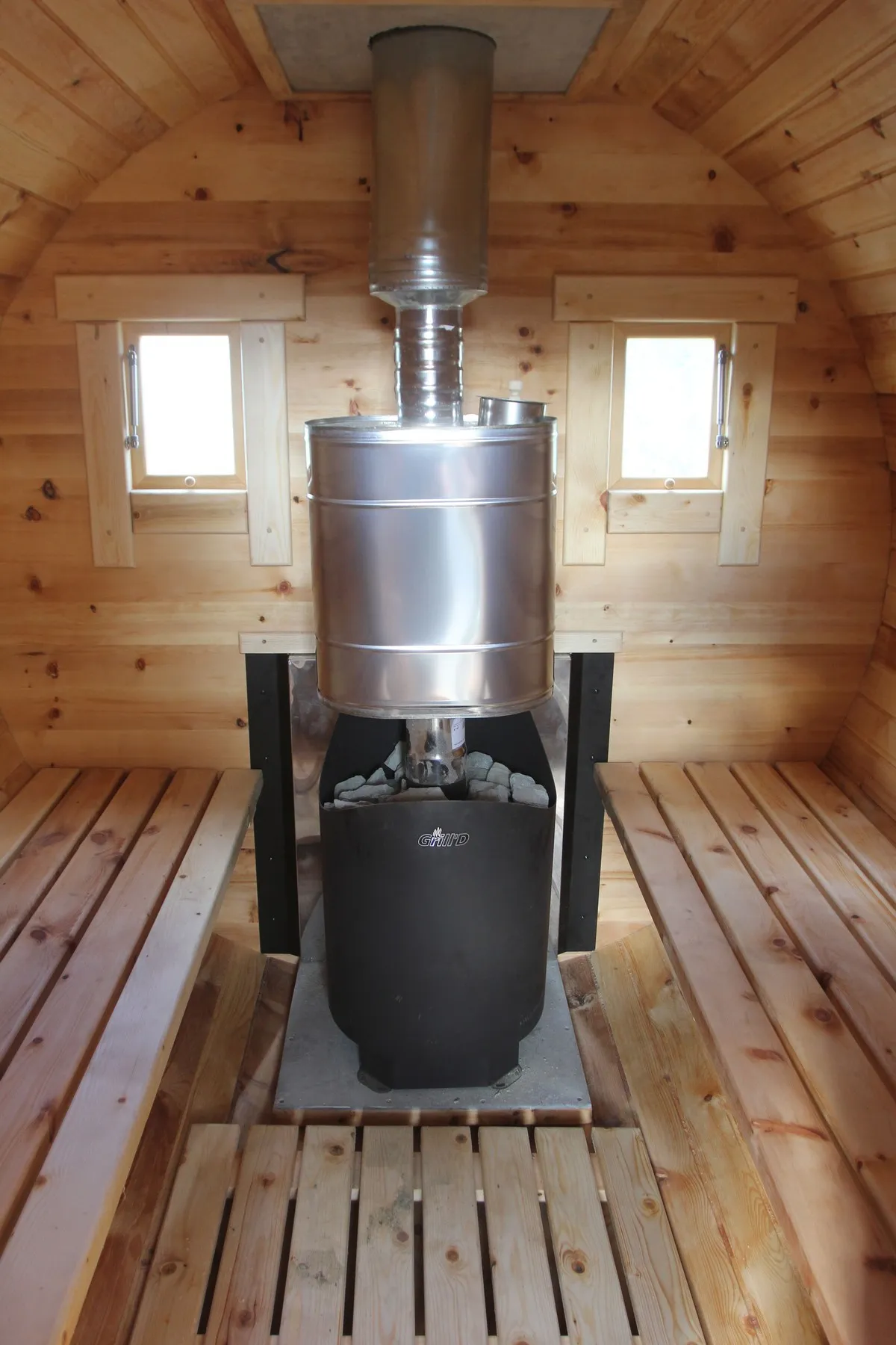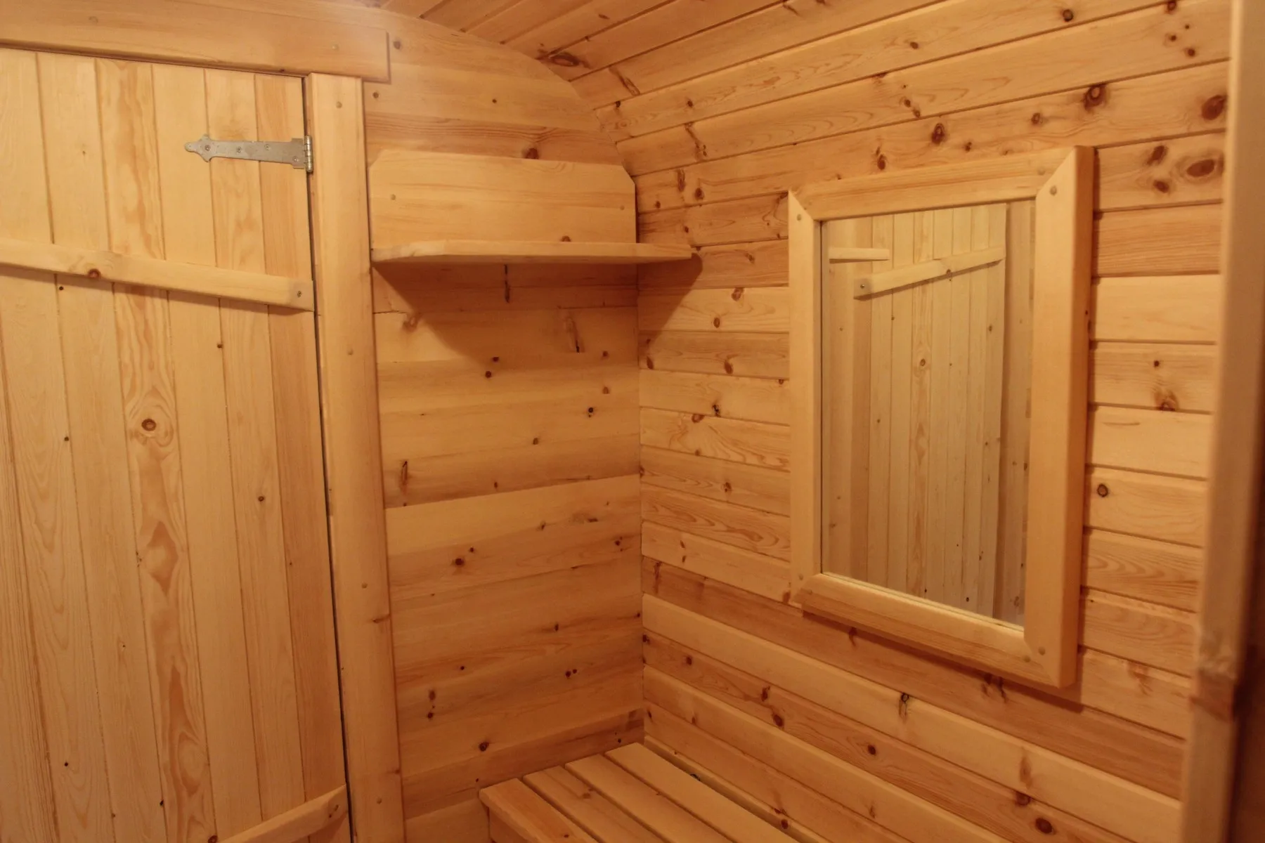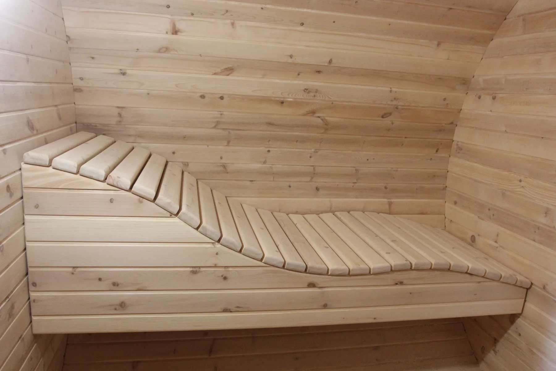Это изделие круглой вытянутой формы с одним парильным отделением. Внутреннее пространство включает в себя печь у дальней стены и лавки из кедра по обе стороны бани. За счет компактной формы баня нагревается в течение 30 минут. По вашему желанию ее можно укомплектовать козырьком, верандой и печью с внешней загрузкой, благодаря которой весь мусор после топки остается на улице. Круглая баня-бочка не требует полноценный фундамент, поэтому при необходимости ее можно перенести в другое место.