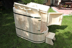 Готовый комплект - это полностью укомплектованный набор с полулежачей фитобочкой для процедур парения. Такая модель наиболее комфортна, так как позволяет принимать процедуры полулежа. Толщина стенок составляет 40-45 мм, что позволяет увеличить срок службы изделия. Фитобочка оборудована откидными створками, дверцей и отверстием для головы. Во время парения человек находится внутри кедровой бочки, а голова снаружи. Благодаря этому исключается возможность перегрева