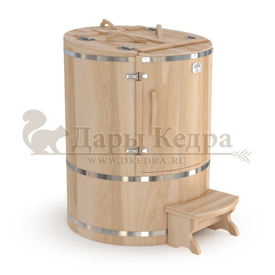 Кедровая бочка (фитобочка) овальная «Классическая» Овальная фитобочка из кедра - это мини парная, которую можно использовать не только в спа-салонах, но и дома. Овальная модель более просторна и удобна в использовании. Толщина стенок составляет 25 мм. Она оборудована откидными створками, дверцей и отверстием для головы. Во время парения человек сидит внутри кедровой бочки, а голова находится снаружи. Благодаря этому исключается возможность перегрева. Подлокотники из кедра, встроенные ручки на створках и двери делают эксплуатацию более удобной. Парение в фитобочке благотворно влияет на организм в целом: повышается иммунитет, выводятся шлаки и токсины, улучшается работа органов тела и состояние кожи. , ,