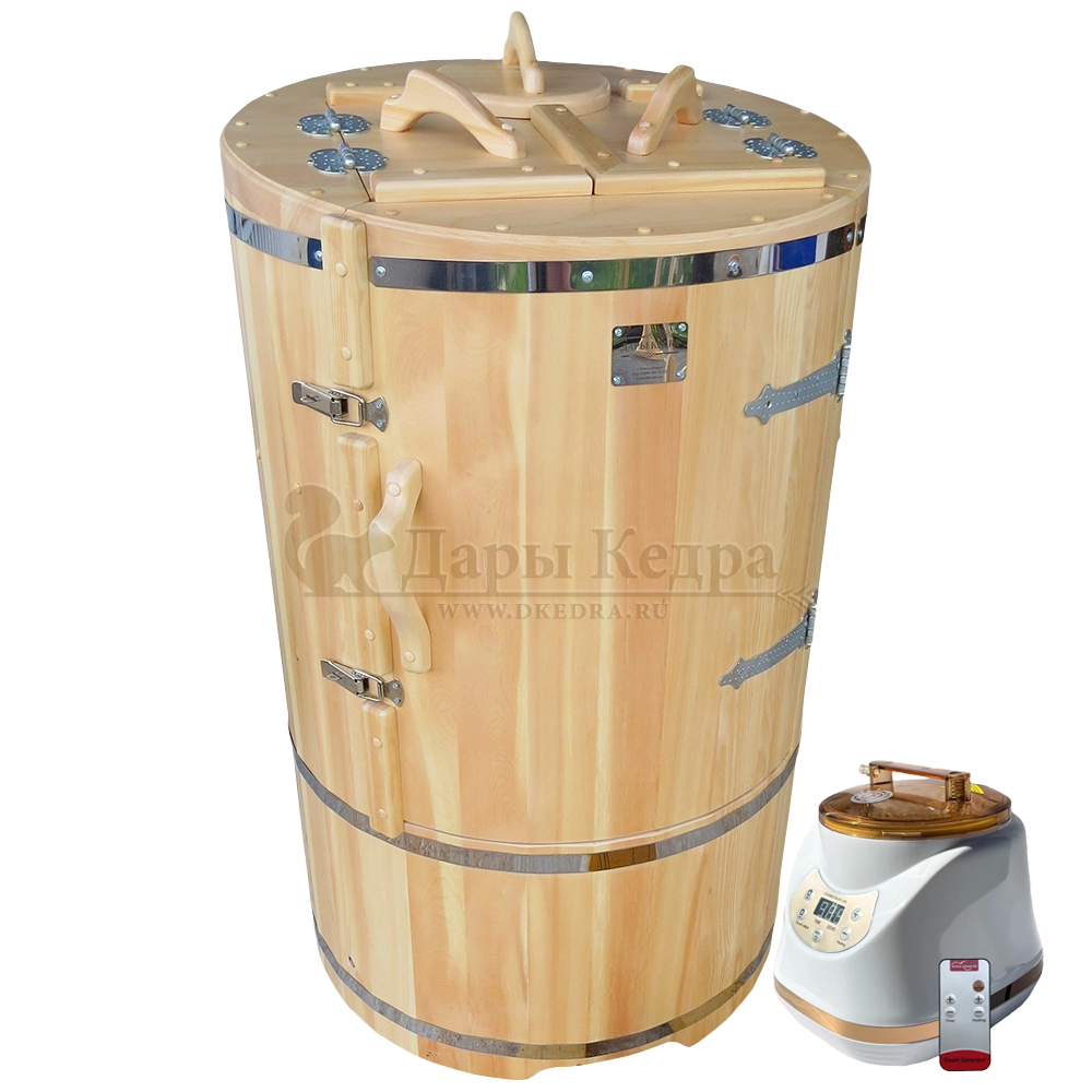 Готовый комплект «Домашний»: кедровая бочка с парогенератором + био-защита изнутри и снаружи Готовый комплект - это полностью укомплектованный набор с фитобочкой для процедур парения. Круглая модель наиболее компактна и мобильна. Толщина стенок составляет 25 мм. Фитобочка оборудована откидными створками, дверцей и отверстием для головы. Верхний скос изделия делает положение головы более комфортным и улучшает обзор. Во время парения человек сидит внутри кедровой бочки, а голова находится снаружи. Благодаря этому исключается возможность перегрева. Подлокотники из кедра, встроенные ручки на створках и двери делают эксплуатацию более удобной. Парение в фитобочке благотворно влияет на организм в целом: повышается иммунитет, выводятся шлаки и токсины, улучшается работа органов тела и состояние кожи. , ,