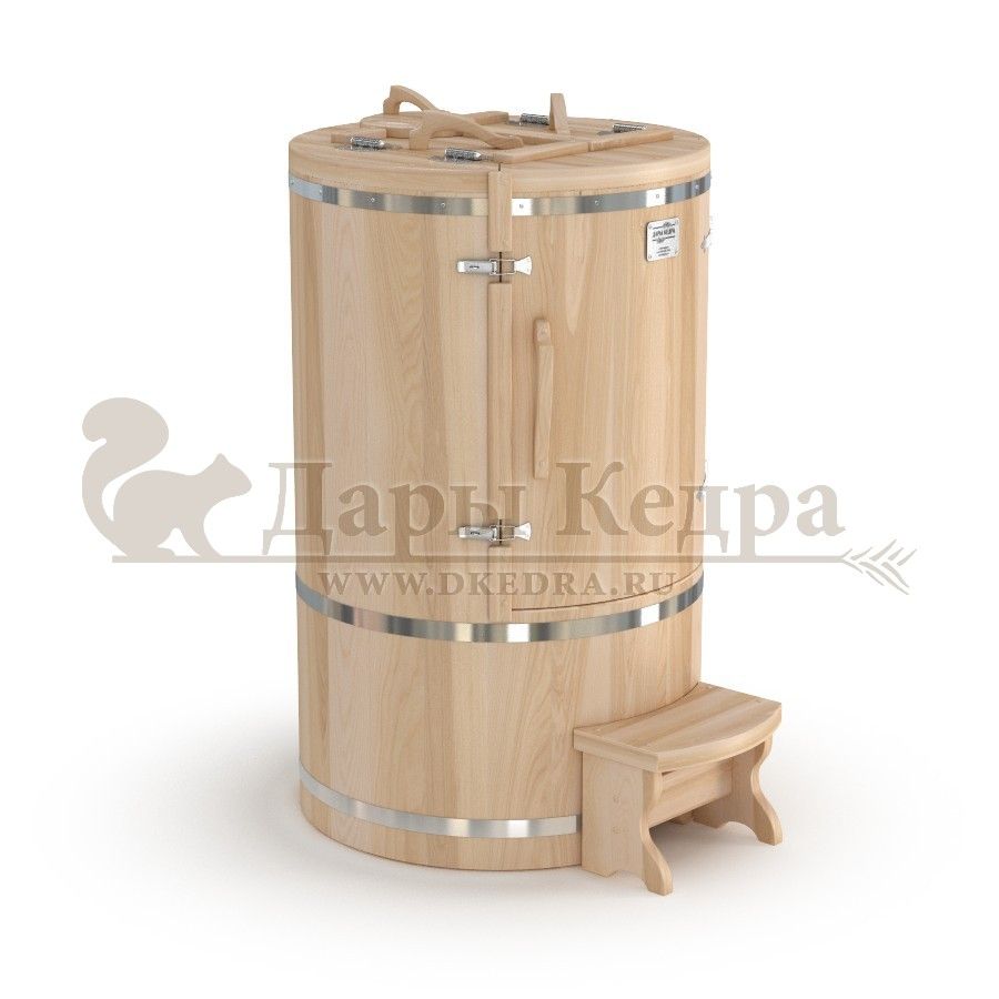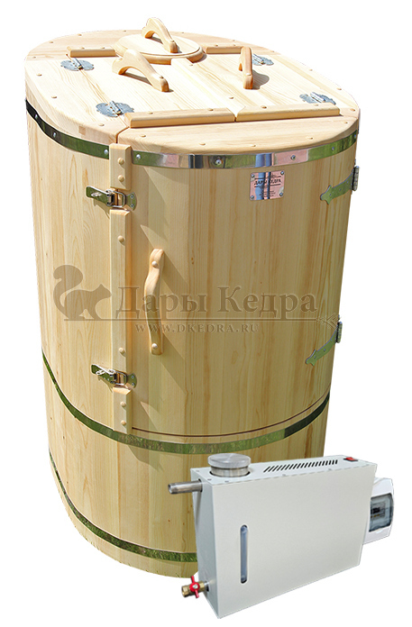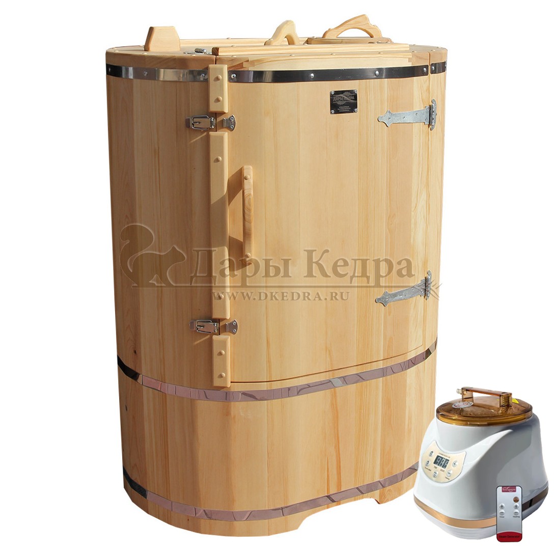 Готовый комплект «Удобный+»: кедровая бочка с парогенератором + био-защита изнутри и снаружи Готовый комплект - это полностью укомплектованный набор с фитобочкой для процедур парения. Овальная модель более просторна и удобна в использовании. Толщина стенок составляет 25 мм. Бочка оборудована откидными створками, дверцей и отверстием для головы. Верхний скос изделия делает положение головы более комфортным и улучшает обзор. Во время парения человек сидит внутри кедровой бочки, а голова находится снаружи. Благодаря этому исключается возможность перегрева. Подлокотники из кедра, встроенные ручки на створках и двери делают эксплуатацию более удобной. Парение в фитобочке благотворно влияет на организм в целом: повышается иммунитет, выводятся шлаки и токсины, улучшается работа органов тела и состояние кожи. , ,