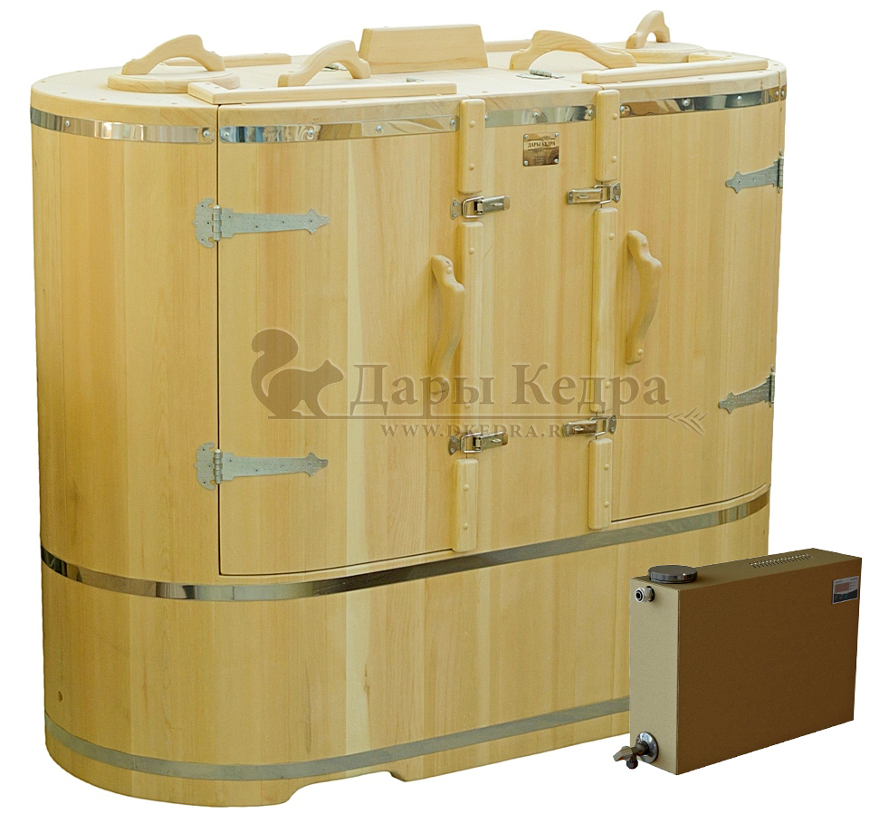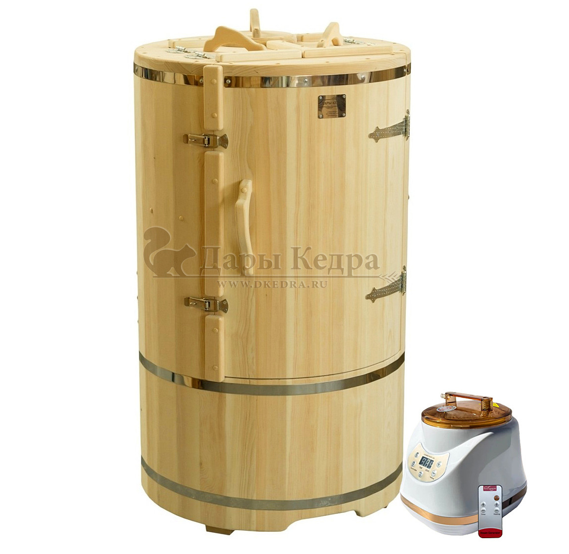 Готовый комплект «Универсальный»: кедровая бочка с парогенератором + био-защита изнутри и снаружи Готовый комплект - это полностью укомплектованный набор с фитобочкой для процедур парения. Овальная модель более просторна и удобна в использовании. Толщина стенок составляет 40-45 мм, что позволяет увеличить срок службы изделия. Верхний скос делает положение головы более комфортным и улучшает обзор. Фитобочка оборудована откидными створками, дверцей и отверстием для головы. Во время парения человек сидит внутри кедровой бочки, а голова находится снаружи. Благодаря этому исключается возможность перегрева. Подлокотники из кедра, встроенные ручки на створках и двери делают эксплуатацию более удобной. Парение в фитобочке благотворно влияет на организм в целом: повышается иммунитет, выводятся шлаки и токсины, улучшается работа органов тела и состояние кожи. , ,