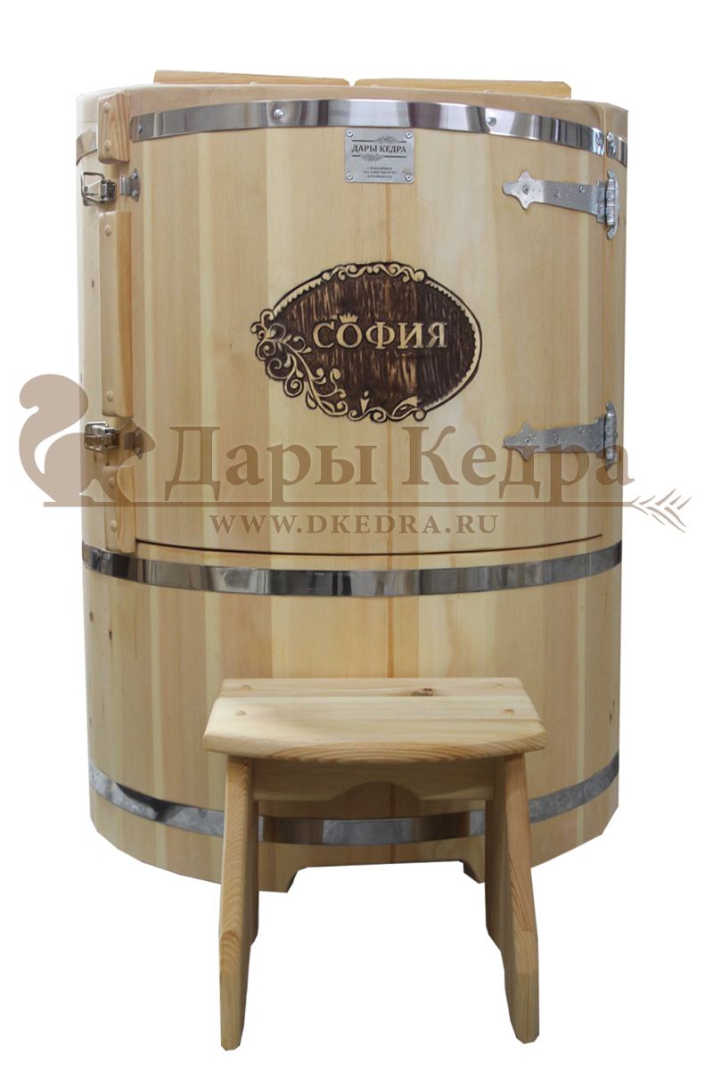 Кедровая бочка (фитобочка) круглая со скосом «Двухрежимная Профессиональная» Фитобочка круглая двухрежимная может быть использована как инфракрасная сауна и парная. Карбоновые излучатели отвечают за сухое парение, они находятся на внутренней стороне стенки. Влажное парение происходит за счет поступления горячего пара в фитобочку через паропровод. Верхний скос изделия улучшает видимость и делает положение головы более комфортным. Бочка оборудована откидными створками, дверцей и отверстием для головы. Во время парения человек сидит внутри кедровой бочки, а голова находится снаружи. Благодаря этому исключается возможность перегрева. Подлокотники из кедра, встроенные ручки на створках и двери делают эксплуатацию более удобной. Парение в фитобочке благотворно влияет на организм в целом: повышается иммунитет, выводятся шлаки и токсины, улучшается работа органов тела и состояние кожи. , ,