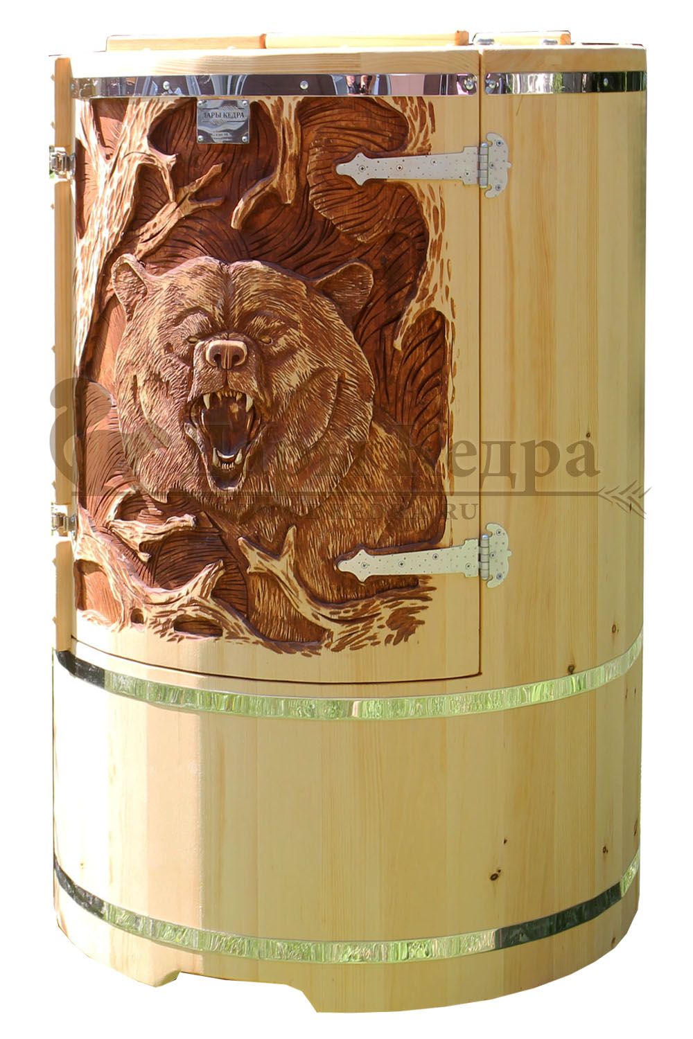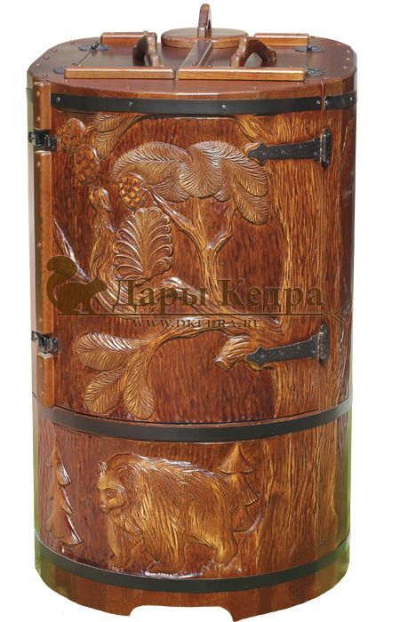 Кедровая бочка (фитобочка) «Фирменная» Это эксклюзивная фитобочка любой модели и комплектации с резьбой вашего логотипа или фирменного знака. Просто приготовьте эскиз рисунка, и наши мастера перенесут его на изделие. Авторский рисунок на фитобочек придаст оригинальность вашему дому или салону красоты, подчеркнёт вашу индивидуальность и непревзойденный вкус. Художественная резьба это ручная работа, выполняется разными мастерами и каждый рисунок неповторим. Вы можете выбрать предложенные варианты резьбы или подобрать изображение и мы предложим вам подходящий эскиз. На сайте представлены наши работы в качестве примера. Каждая резьба рассчитывается индивидуально и может быть нанесена на любую модель фитобочки. Парение в фитобочке благотворно влияет на организм в целом: повышается иммунитет, выводятся шлаки и токсины, улучшается работа органов тела и состояние кожи. Обязательно обращайте внимание на размер дверных проемов вашего помещения. Если они меньше 78 см, то закажите разборную модель! , ,