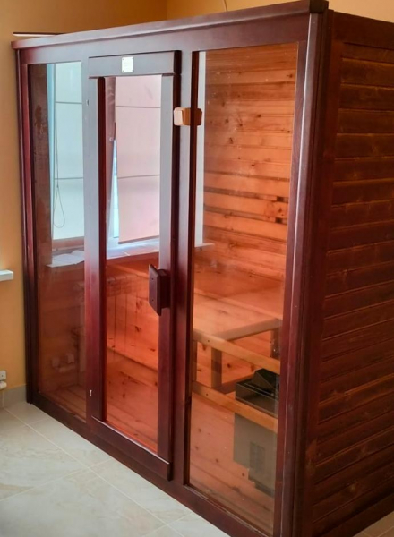 Это специально оборудованная кедровая кабина для прогрева тела человека сухим теплом. Воздух в таких парных не нагревается. Инфракрасные лучи воздействуют на тело, равномерно прогревая мышцы, суставы и органы. Керамические излучатели похожи на лампы, имеют высокую температуру нагрева, поэтому защищены противоожоговыми решетками. Тело человека в таких саунах нагревается интенсивнее. Работает кабина за счет электричества. Установка сауны в угол, позволяет рационально использовать пространство помещения. Подходит как для домашнего использования, так и для коммерции.